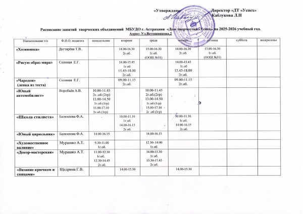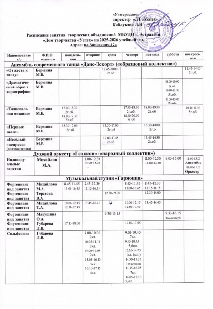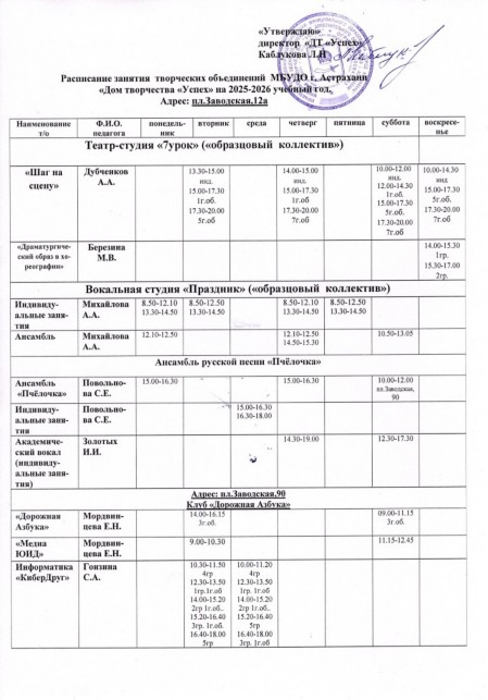 Расписание занятий творческих объединений