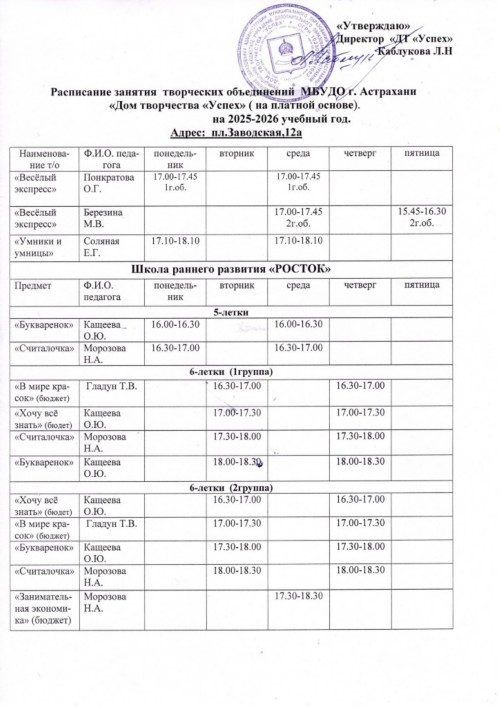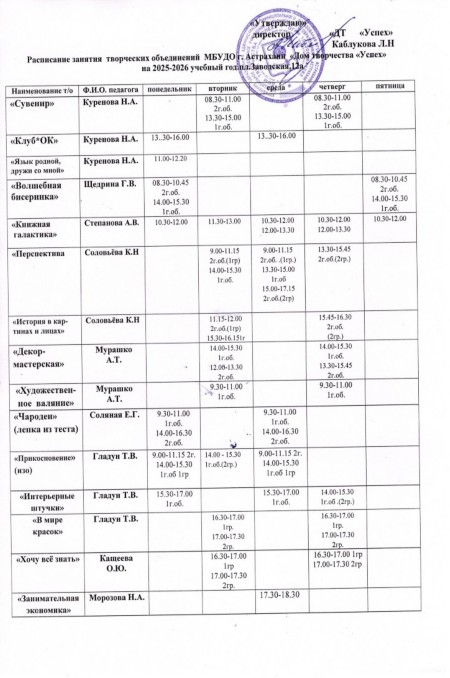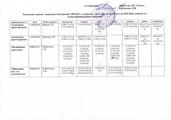 Расписание занятий в творческих объединениях на базе образовательных организаций