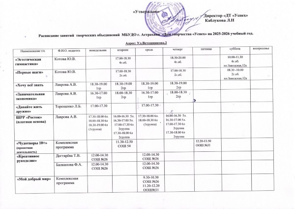 Расписание занятий в творческих объединениях по адресу ул. Н. Ветошникова, 2